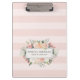 Elegant floral clipboard features your name and/or business name framed by a border of lush watercolor flowers in blush pink, sage green, peach and cream, on a background of tone on tone pastel blush pink stripes. Matching business cards and accessories are available below or in our shop.
