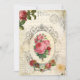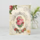 Gorgeous pink rose bouquet in engraved filigree oval frame with French text, postal typography, handwritten script flourishes and roses on distressed buff background.