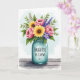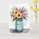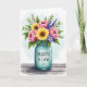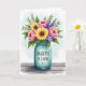 Designed with a softly painted floral scene, the card centers on a full bouquet rising from a pale blue-green glass jar, drawn with gentle, water-washed edges. Large yellow blooms with deep brown centers lean toward clusters of rosy pink flowers, as if they’re sharing a close, affectionate moment ❤️. Slender lavender spikes and small star-shaped purple blossoms peek through layers of lush green leaves, adding depth and a cozy, friendly closeness to the arrangement. The jar has a slightly old-fashioned shape with faint threading at the rim, and it sits on a rustic wooden surface with subtle grain lines. A short message appears directly on the front of the jar in small, neat lettering, set in a darker ink tone that stands out against the glass. Behind everything, the background fades into a light cerulean wash with cloud-like texture, keeping the scene airy and calm 🌼. The yellow petals catch the light near the center while the pink and purple flowers cluster around them, framed by green foliage against the soft blue backdrop.