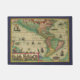 Vintage illustration antique world map featuring the Americas, 1606, this international chart includes North, Central and South America and the Atlantic and Pacific Oceans. By cartographer Jodocus Hondius (aka Jodocus Hondius the Elder). Ships are sailing on the seas with a variety of marine life and there is a scene with native people and animals in the corner inset.