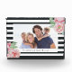 Create a sweet keepsake with our chic floral photo block, featuring your favorite horizontal or landscape oriented photo framed by a charcoal off-black and white stripes and accented with clusters of blush pink watercolor peony flowers and sage green leaves. Add your custom message using the field provided; we love it with "We Love You Mom" and the year for a unique Mother's Day, birthday or new mom gift.