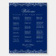 The alphabetical seating chart is for a wedding with blue and silver colors.