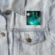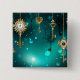 Gold, antique keys with gears and dials hang on gold chains on luminous green background.