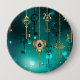 Gold, antique keys with gears and dials hang on gold chains on luminous green background.