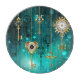 Gold, antique keys with gears and dials hang on gold chains on luminous green background.