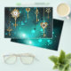 Gold, antique keys with gears and dials hang on gold chains on luminous green background.