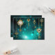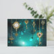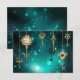 Gold, antique keys with gears and dials hang on gold chains on luminous green background.