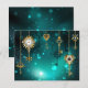 Gold, antique keys with gears and dials hang on gold chains on luminous green background.