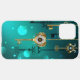 Gold, antique keys with gears and dials hang on gold chains on luminous green background.