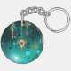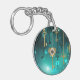Gold, antique keys with gears and dials hang on gold chains on luminous green background.