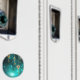 Gold, antique keys with gears and dials hang on gold chains on luminous green background.