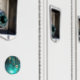 Gold, antique keys with gears and dials hang on gold chains on luminous green background.