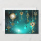 Gold, antique keys with gears and dials hang on gold chains on luminous green background.