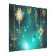 Gold, antique keys with gears and dials hang on gold chains on luminous green background.