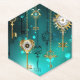 Gold, antique keys with gears and dials hang on gold chains on luminous green background.