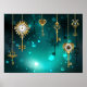 Gold, antique keys with gears and dials hang on gold chains on luminous green background.