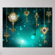Gold, antique keys with gears and dials hang on gold chains on luminous green background.