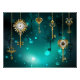 Gold, antique keys with gears and dials hang on gold chains on luminous green background.