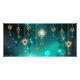Gold, antique keys with gears and dials hang on gold chains on luminous green background.