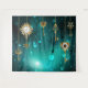 Gold, antique keys with gears and dials hang on gold chains on luminous green background.