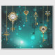 Gold, antique keys with gears and dials hang on gold chains on luminous green background.