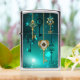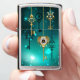 Gold, antique keys with gears and dials hang on gold chains on luminous green background.