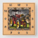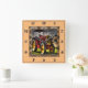 This vintage tractor has a old brown steal roof cover on it. With old yellow metal rims.The body id red and the front grill is yellow.You can see the gray clouds and green grass.This clock has a abstract brown numbers from 1 to 12.And a abstract frame and the light orange background. The background color can be change to any color you want it to be with the custom tag.