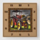 This vintage tractor has a old brown steal roof cover on it. With old yellow metal rims.The body id red and the front grill is yellow.You can see the grey clouds and green grass.This clock has brown wood numbers from 1 to 12.brown wood frame and the light brown back ground. The background color can be change to any color you want it to be with the custom tag.