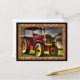This vintage tractor has a old brown steal roof cover on it. With old yellow metal rims.The body id red and the front grill is yellow.You can see the grey clouds and green grass.This postcard has a wood floor brown frame and the black background. The background color can be change to any color you want it to be with the custom tag.This postcard you can add text at the same time..