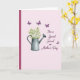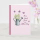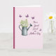 The front design shows a soft, pale rose background that sets a gentle, affectionate tone ❤️. An antique-style watering can in muted metallic gray sits to the left, angled as if it’s just been set down after tending a garden. From the spout, small white flowers with dark centers spill out among fresh green leaves, their drape suggesting a tender offering to someone special. A few tiny winged insects flutter nearby with fuchsia wings and darker accents, adding a light, friendly energy 🌼. On the right side, a short message of appreciation appears in flowing cursive-style lettering in a rich plum color, spaced with plenty of breathing room. A deep rose, lightly textured vertical border runs along the left edge, giving the layout a balanced frame. The overall illustration keeps the focus on the watering can and the bouquet, with the insects scattered across the open background for movement and contrast. The flower petals are crisp white, the leaf greens range from soft to deep, and the insects’ wings stand out in bright pink against the rosy backdrop.
