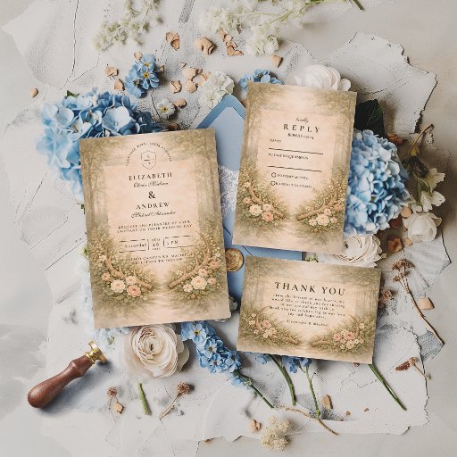 A romantic woodland-inspired design featuring soft neutral florals, elegant antlers, and a warm vintage parchment background. The composition blends organic greenery with refined details for a timeless boho aesthetic that feels intimate, natural, and quietly luxurious—perfect for couples drawn to classic romance with a rustic, nature-forward touch.
