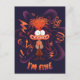 This illustration captures "Anxiety," a character from the Disney/Pixar movie "Inside Out 2," amidst a tempest of worry and panic. Dark, swirling shapes and jagged lines envelop the character, symbolizing the overwhelming nature of anxiety. The character's fiery red hair and wide, fearful eyes emphasize their distress, while their nervous smile and tightly clasped hands betray a struggle to appear calm. The phrase "I'm fine" poignantly contrasts with the intense emotions depicted, shedding light on the often hidden struggles with mental health.