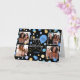 Create a stylish photo collage greetings card! Personalize the template with four favorite photos, the recipient's name, and birthday age. A fun design featuring round confetti, balloons, and "Happy Birthday" in a trendy script. Perfect for family, kids, friends, and pets! Printed colors: blue, black, white and gold.