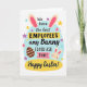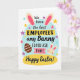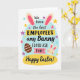 This design shows an irregular, soft sky-blue oval shaped like a festive egg, with two cream-colored bunny ears rising from the top and pink inner details 🐰. Across the center, the words “any Bunny” appear in a smooth, flowing style in dark lettering, giving the layout a friendly, close-to-you tone. Just below, “EMPLOYEES” stands out in tall, thick sans-serif letters set on a bright yellow banner, like a cheerful sign meant to be noticed. Small flowers and starburst shapes scatter around the blue area in lavender, fuchsia, and goldenrod, adding a spring garden feel 🌷. On the left side sits a chocolate-brown egg shape decorated with pink stripes and dots, like a sweet treat tucked into the scene. On the right, a simple bunny face with tiny eyes and a small nose looks inward, as if sharing a quiet, companionable moment with the message. Near the bottom, a second yellow banner carries a short Easter greeting in a flowing dark style, centered and easy to read. The overall layout keeps the blue egg central, with the candy-like egg on the left and the small bunny face on the right.
