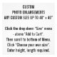 Any Custom Size Photo Enlargements to Personalize. Choose your own size. Customizable dimensions. Maximum 40" x 40". Minimum 4" x 4". DESIGN YOUR OWN: Fully customizable Photo Print Enlargements. Add your own words, text, image and personalize your photo enlargements. CHOOSE YOUR OWN CUSTOM SIZE: Choose a custom size from 4" x 4" up to 40" x 40". Just click the drop down "Size" menu above "Add to Cart". Scroll to bottom of Menu. Then click "Choose your own size". Enter height and length required. Create your own customisable, personalised photo print enlargement gifts and products for a birthday, for Christmas, for marketing and promotional use, or simply for your home or yourself. Add your own text, name, words, pattern, motif, monogram (monogramme), image or personal design. Ideal for making photo posters. Various standard and custom frame options available.