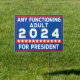 Make a witty statement about the 2024 election with our 'Any Functioning Adult 2024' Political Yard Sign. With a touch of humor, this sign expresses the sentiment of many during the political season. Let your lawn reflect your take on the upcoming election with this eye-catching sign
