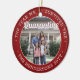 Celebrate making it through family togetherness at home with a custom 2 photo "The Year We Survived The Quarantine" red and white round Christmas ornament. All text and images on this template are simple to personalize and can be different or the same on front and back. (IMAGE & TEXT DESIGN TIPS: 1) To adjust position of wording, add spaces at beginning or end. 2) To center the photo exactly how you want, crop it into a square shape before uploading to the Zazzle website.) Design features a stylish red ombre and white border, handwritten style calligraphy, family name & year, and two pictures of your choice. This unique & modern coronavirus social distancing ornament makes a cute and humorous addition to holiday tree decorations or a funny Covid-19 pandemic Xmas gift idea.