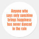 Rainy days may depress some people. For others, it brings new opportunities to dance! Reads "Anyone who says only sunshine brings happiness has never danced in the rain."
