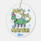 Adorable Baby's First Christmas ornament, with a cartoon apatosaurus (brontosaurus). The adorable patchwork dinosaur stuffed animal is mint green and purple, wearing a Santa hat, Xmas lights around his neck, and a yellow tree star on his tail! Fun holiday gift for your infant. Instantly customize the year.