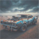 Blue Classic 1969 Chevy Camaro with blower and spots of rust out in the desert during apocalypse.
