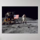 Astronaut John W. Young, commander of the Apollo 16 lunar landing mission, leaps from the lunar surface as he salutes the U.S. Flag at the Descartes landing site during the first Apollo 16 extravehicular activity (EVA-1). Astronaut Charles M. Duke Jr., lunar module pilot, took this picture. The Lunar Module (LM) "Orion" is on the left. The Lunar Roving Vehicle is parked beside the LM. The object behind Young in the shade of the LM is the Far Ultraviolet Camera/Spectrograph. Stone Mountain dominates the background in this lunar scene.