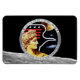 Apollo 17 was the final mission of the NASA Apollo lunar landing program, and was the sixth and last landing of humans on the Moon. The insignia is contains an image of the Greek sun god Apollo, an American eagle, red bars representing the U.S. flag; and three white stars symbolizing the three astronaut crewmen; Eugene Cernan, Ronald Evans, and Harrison Schmitt. The background shows deep space, the Moon, the planet Saturn, and a spiral galaxy.