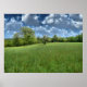 A rich green landscape, with a field of tall grass edged with trees under a deep blue sky full of clouds. A gnarled dead tree stands by itself in the middle of the field.