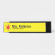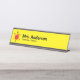 A red apple, a b c, and 1 23 are next to two lines of text. You can edit the text to show your name and job title. The desk name plate is yellow.