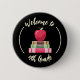 A round black pin button with a red apple a three books . The text reads "Welcome to 4th Grade " , but you can change it with the grade level you are teaching . It is a fun way to welcome young students on the first day of school .