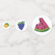 Design features an original marker illustration of colorful fruits including apples, lemons, limes, grapes, watermelon, bananas, strawberries and grapefruit.