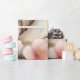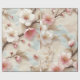 A serene image capturing delicate apple blossom branches against a tranquil backdrop of light tan and soft blue hues.