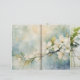 Watercolour apple blossom branches on a pale green blue, mottled background.