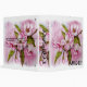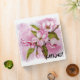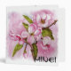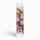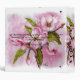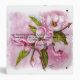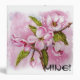 A branch of delicate pink apple blossoms with white hightlights on a blue and pink cloud-like background also boasting buds ready to burst. Originally watercolor painted by the designer