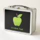 Green apple with leaf icon. Custom background color. Custom text on both sides.